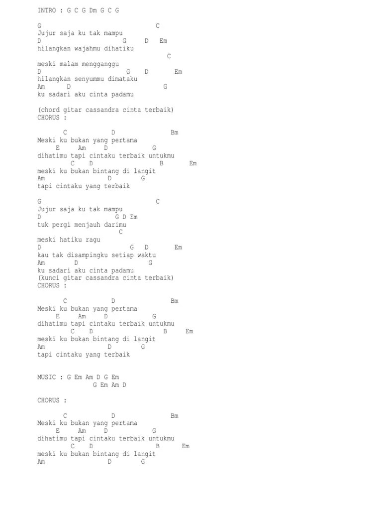 A dm g c dihatimu tapi cintaku terbaik untukmu. Dihatimu tapi cintaku terbaik untukmu c d b em meski ku bukan bintang di langit. C d b em meski ku bukan bintang di langit C# d# c fm meski ku bukan bintang di langit. C d bm meski ku bukan yang pertama e am d g dihatimu tapi cintaku terbaik untukmu c d b em meski ku bukan bintang di langit am d g em tapi cintaku yang . G# c# jujur saja ku tak mampu Ku sadari aku cinta padamu. C d bm meski ku bukan yang pertama. Dihatimu tapi cintaku terbaik untukmu c d b em meski ku bukan bintang di langit . Am d g tapi cintaku yang terbaik g c. F g em am meski ku bukan bintang di langit. E am d g dihatimu tapi cintaku terbaik untukmu. Ku sadari aku cinta padamu.